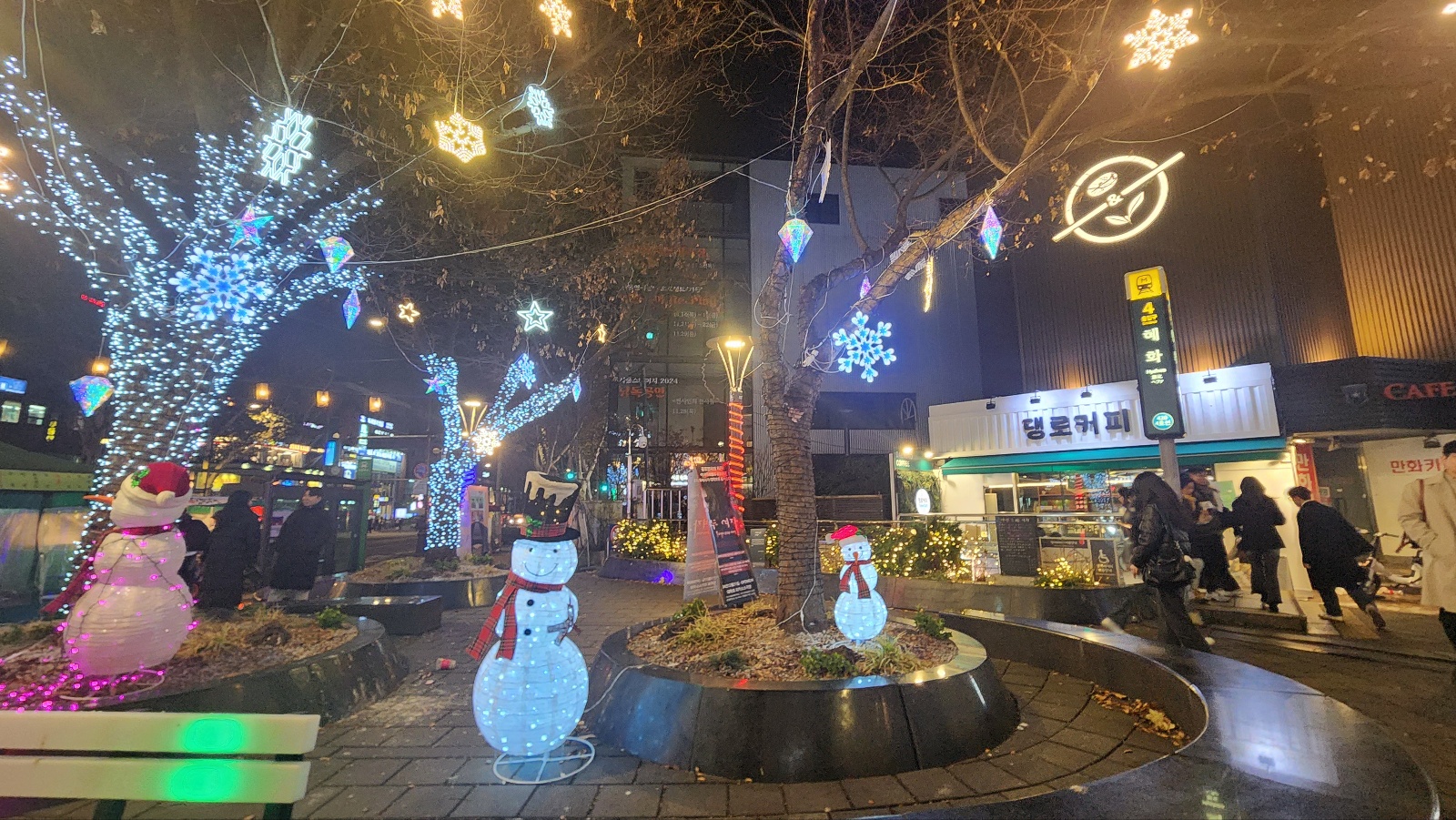 연말 모임이 끝나고 돌아오는 길에 혜화역을 찍었다. 연말을 맞아 혜화역은 예쁘게 꽃단장을 했다. 반짝반짝이는 트리 조명에 눈사람 캐릭터 조명까지 예뻤다. 작년에도 아기자기하게 꾸며져있었는데, 연말마다 혜화역은 예쁜 공간이 되는 것 같다.